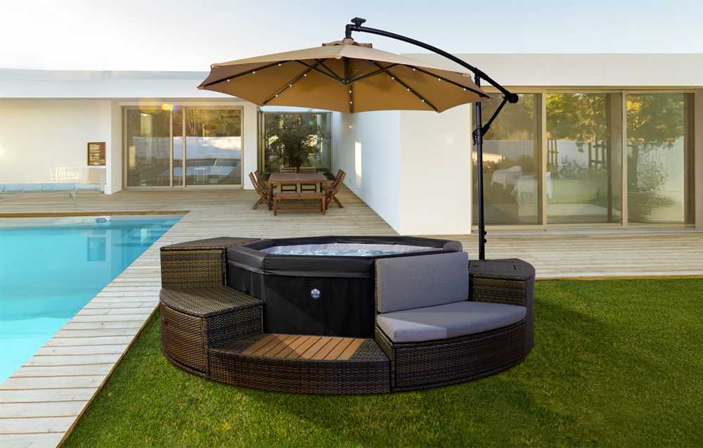 Ce pack convient particulièrement à l’aménagement d’un espace spa, d’un coin détente ou d’une zone de repos en extérieur. Il associe ombrage en journée, éclairage d’ambiance le soir et base mobile pour un usage plus souple au fil de la saison.
