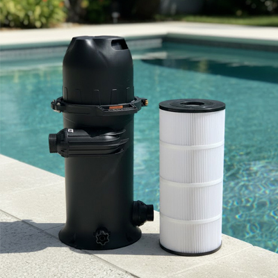 Contrairement aux filtres à sable, un filtre à cartouche ne nécessite aucun contre-lavage. Pour nettoyer la cartouche, il suffit simplement de déposer la partie supérieure, de sortir la cartouche puis de la rincer au jet d’eau.